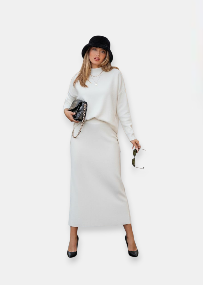 Ensemble en maille léger et chaud idéal pour l'extérieur comme pour l'intérieur. Une pièces indispensable pour votre garde-robes hivernale. Pull et jupe en maille serrée.